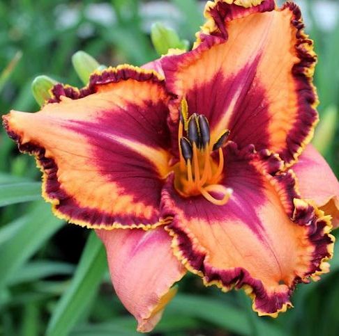 Flower size: 18 cm, plant height: 60 cm, foliage: semi-evergreen, ploidy: TET Flowers large, peach coloured with a triangular shaped purple-burgundy ring and a yellow throat. Petal edges with purple and cream border, ruffled and laced. Up to 22 buds on one plant. A truly magnificent daylily, rarely offered...