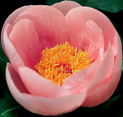 Soft salmon pink single flowers are saucer-shaped. Opening buds hold a true perfect cup-shape for a long time. Pink color shading to a deeper tone at the base of the petals, which surround the golden stamen centre. Perfectly formed, the flowers display a grand elegance and finesse. Flowers mildly fragrant. A lovely peony indeed...