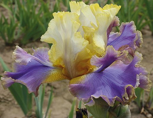 Flowers ruffled, standards pearl, violet midrib flush, narrow yellow gold band widening at base, falls violet blue, gold rim and haft. Beards yellow gold, violet flounce edged spoon. Flowers slightly fragrant. Beautiful iris…