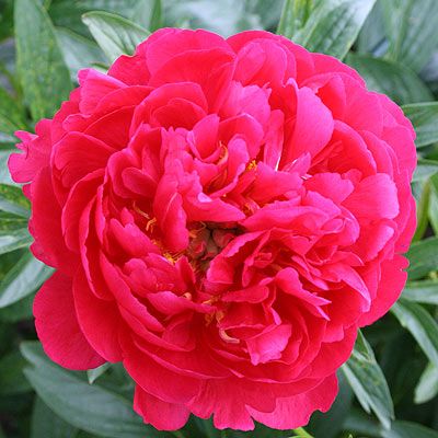 Flowers semi-double, large, a cup form, raspberry red with golden stamens in the centre. Blooming quite a bit ahead of other full-flowered peonies, lasts forever as a cut flower. Thick and very strong stems, plant habit of Coral Charm, height 85 cm. Beautiful peony, only rarely offered.