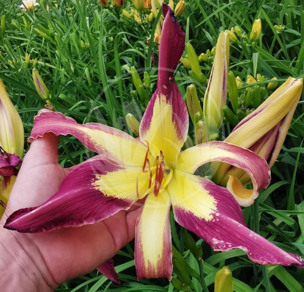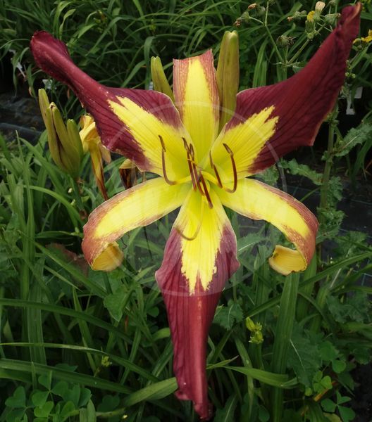Květy velké, pavoukovité, zvlněné, tmavě vínově až švestkově červené s kontrastním žlutým středem a zeleným hrdlem. Špičková denivka pavoukovitého (spider) typu, s unikátním tvarem květů.