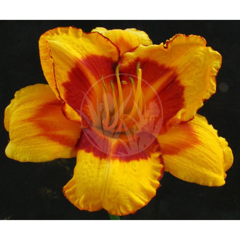 Květy zlatavě oranžové, s burgundsky červeným prstencem okolo zlatožlutého hrdla. Okraje okvětních lístků zvlněné. Pěkná, vysoce hodnocená denivka.
