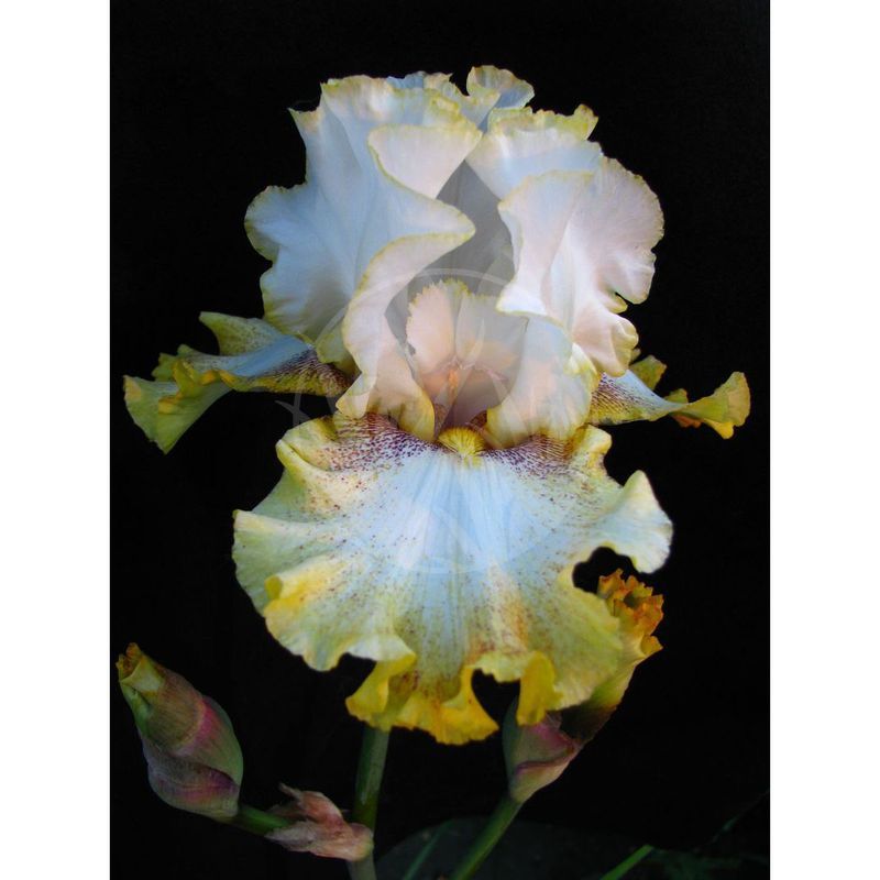 Dóm bílý se žlutým lemem, zvlněný, fally bílé, jemně pískované světlounce švestkovou, žlutý zvlněný lem. Kartáčky žluté a oranžové. Unikátní barevná kombinace, pozdní odrůda.