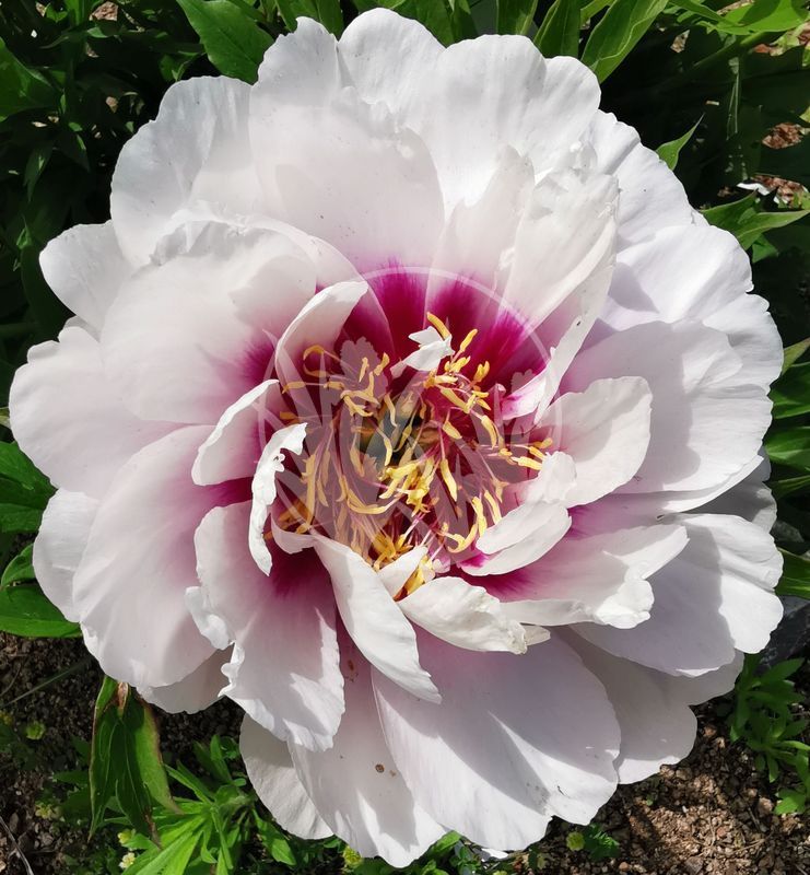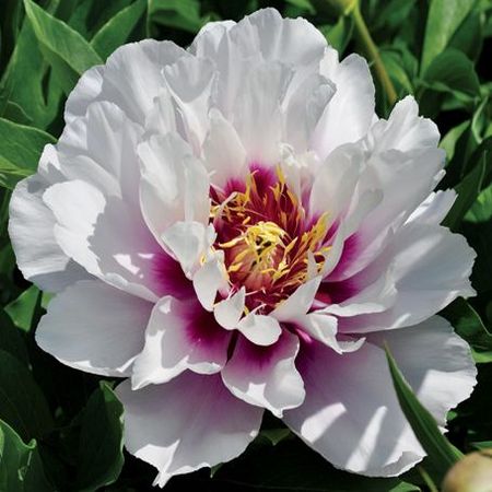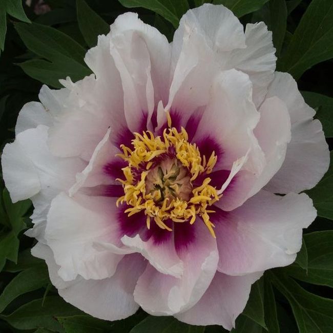 Velké, poloplné květy jsou bílé, ve středu s výrazným fialovým zbarvením. Tento perfektní kontrast velmi připomíná typ květů čínských dřevitých pivoněk (hybridy P. rockii). Silné stonky drží květy vzpřímené. Nádnerné, jemně vonné květy. Úžasná odrůda...