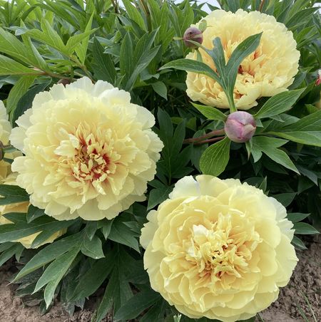 POLODŘEVITÁ PIVOŇKA (Itoh) Květy velmi plné, obrovské - až 25 cm velké, sytě žluté. Listy při rašení na jaře červené, později zelené, keře dorůstají výšky 80 cm. Plně mrazuvzdorná, nejlepší žlutá plnokvětá pivoňka současnosti. Relativně nová, jedinečná a velmi žádaná...