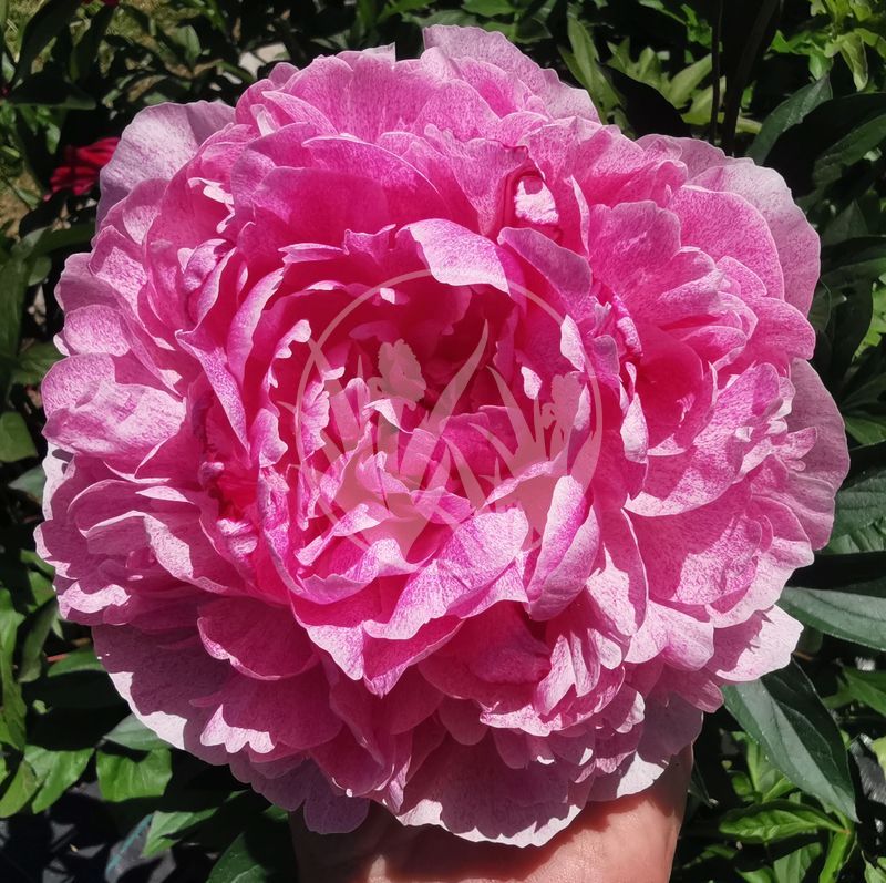 Květy velké, plné, světle růžové, hustě tečkované tmavě fialově až purpurově. Unikátní odrůda s perfektními plnými tečkovanými květy. Zdravý růst, pěkné olistění, prostě klenot mezi pivoňkami. Nová odrůda, dosud velmi vzácná, nádherná, doporučuji!